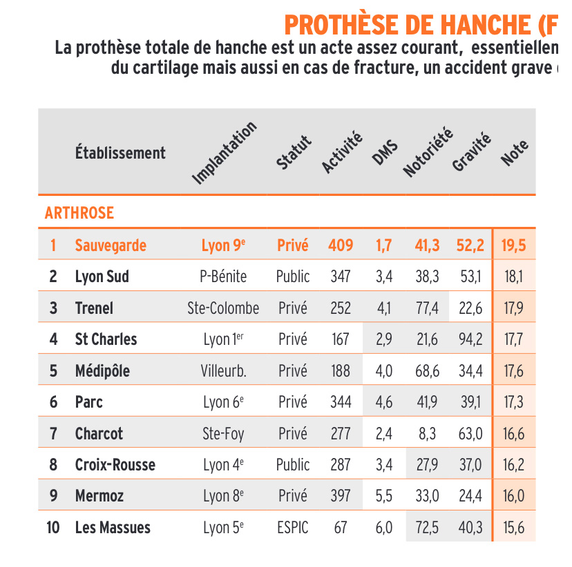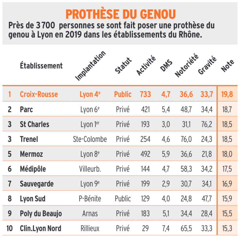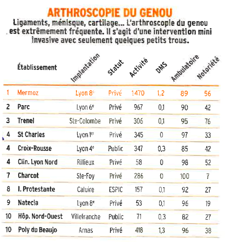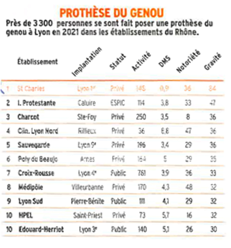 La clinique Saint Charles se classe première sur la pose des PTG devant tous les établissements lyonnais au classement MAG2LYON. Une fierté pour toute l'équipe et pour l’établissement! Elle se classe 4ème pour les arthroscopie du genou (Traitement des lésions du ligament croisé antérieur et des lésions méniscales).